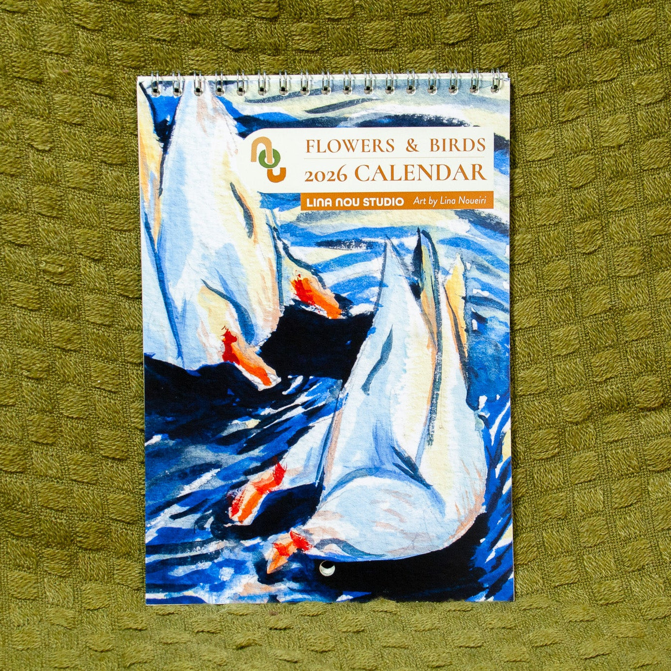 A hanging wall calendar for 2026, with artwork for each month relating to the theme of Flowers & Birds! All artwork is by Lina Noueiri, along with the design of the calendars.