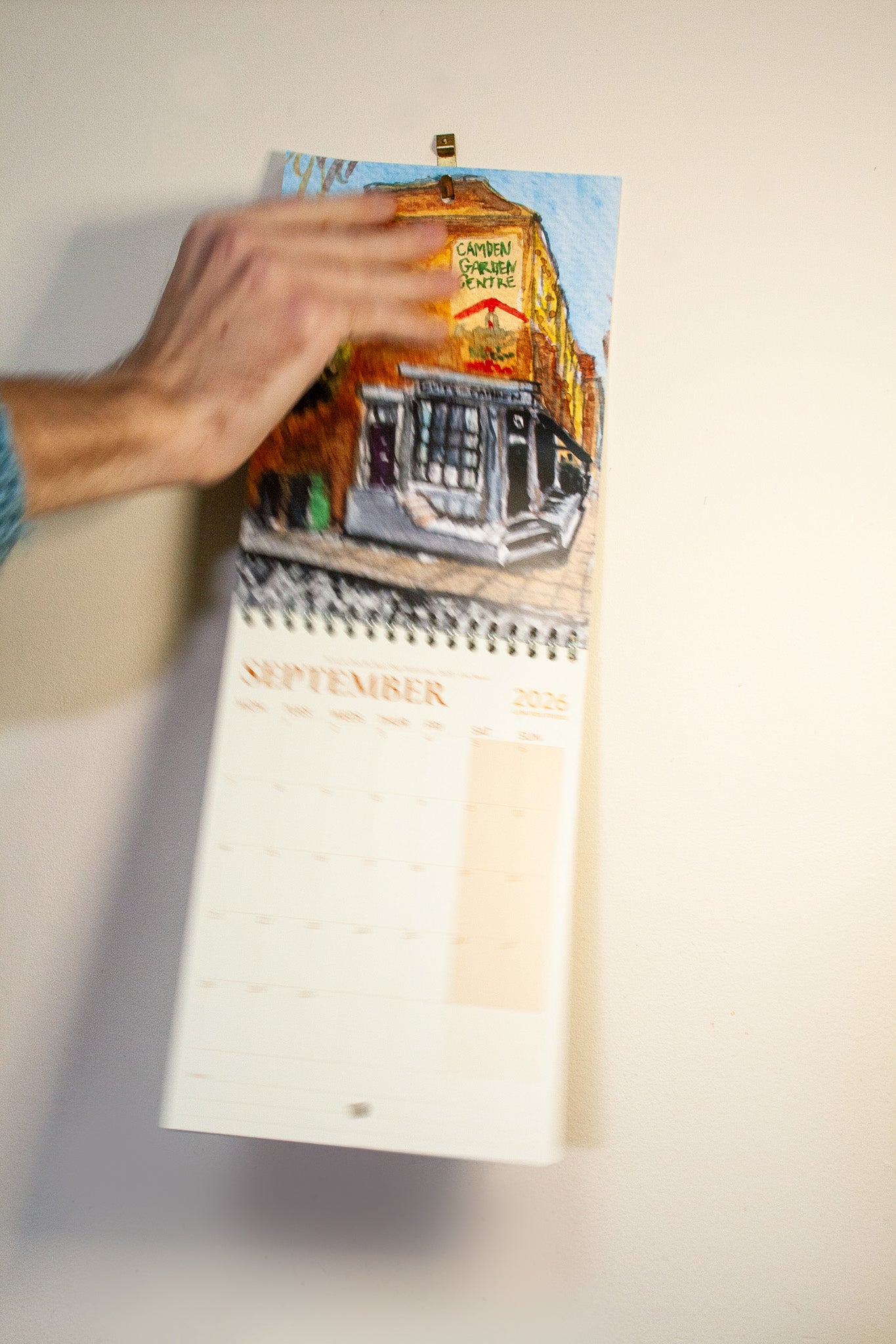 A hanging wall calendar for 2026, with artwork for each month relating to the theme of Landscapes and Places! All artwork is by Lina Noueiri, along with the design of the calendars.