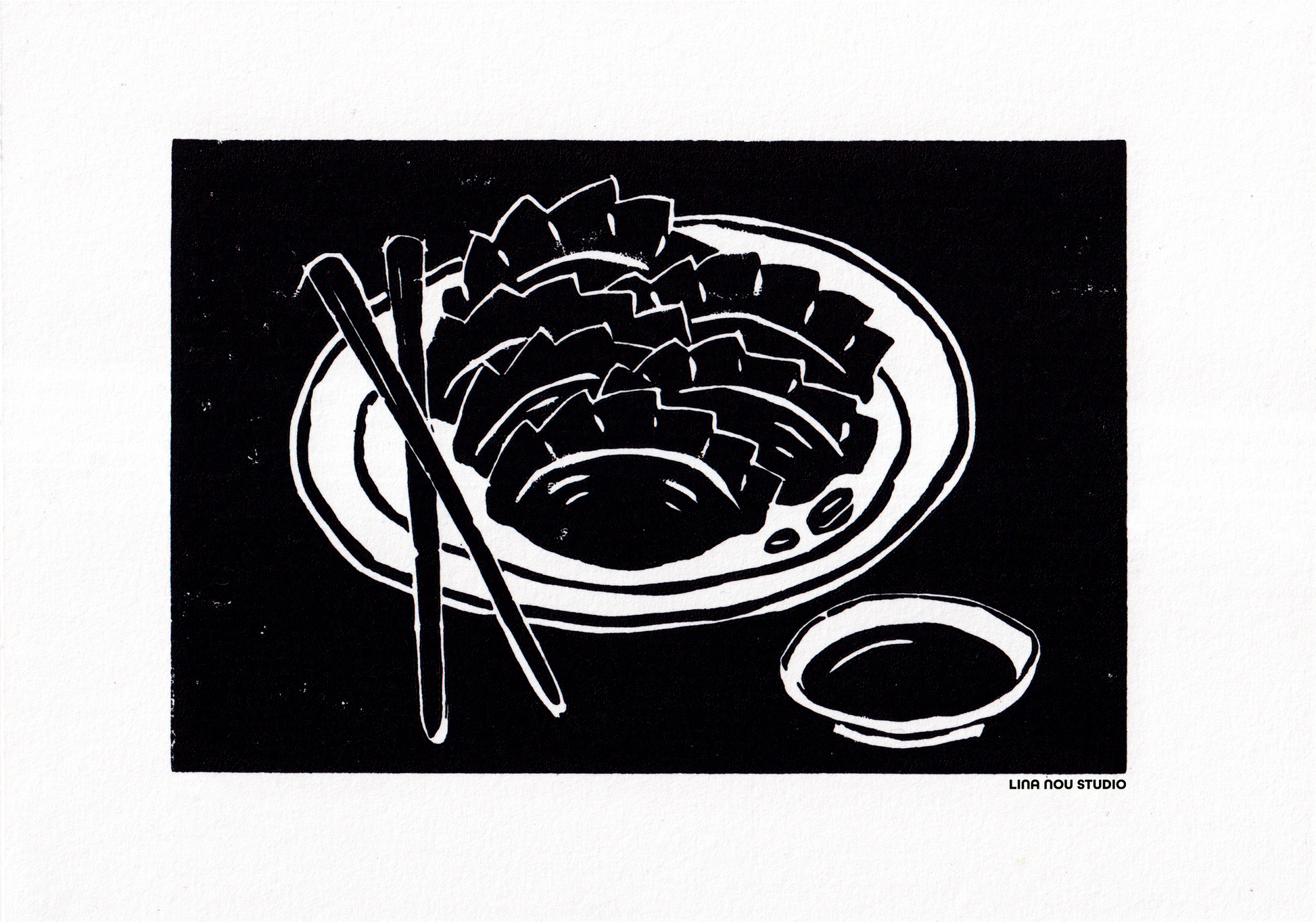 'Dumplings on a Plate' Lino Print (smooth paper)