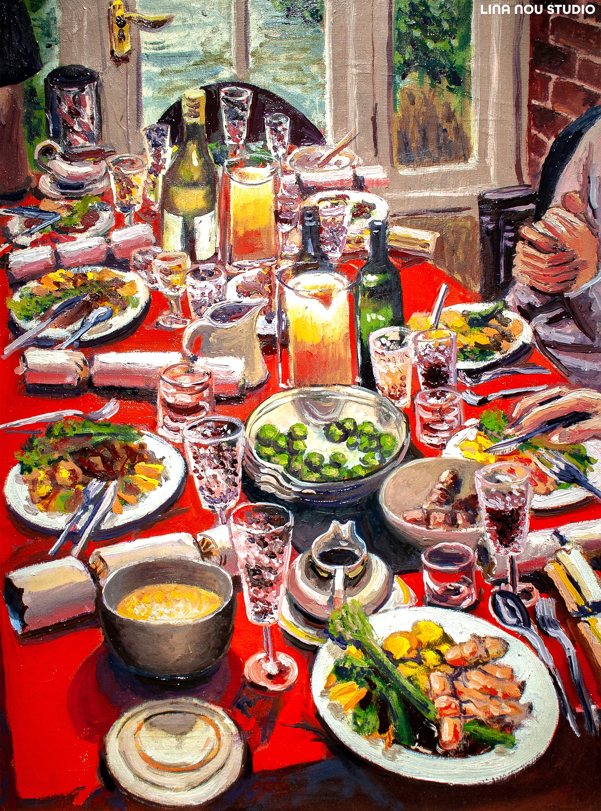 A festive meal is spread out on a full table with a bright red table cloth. Plates are piled high with classic Christmas staples and hands begin to reach into the scene to begin tucking in.
