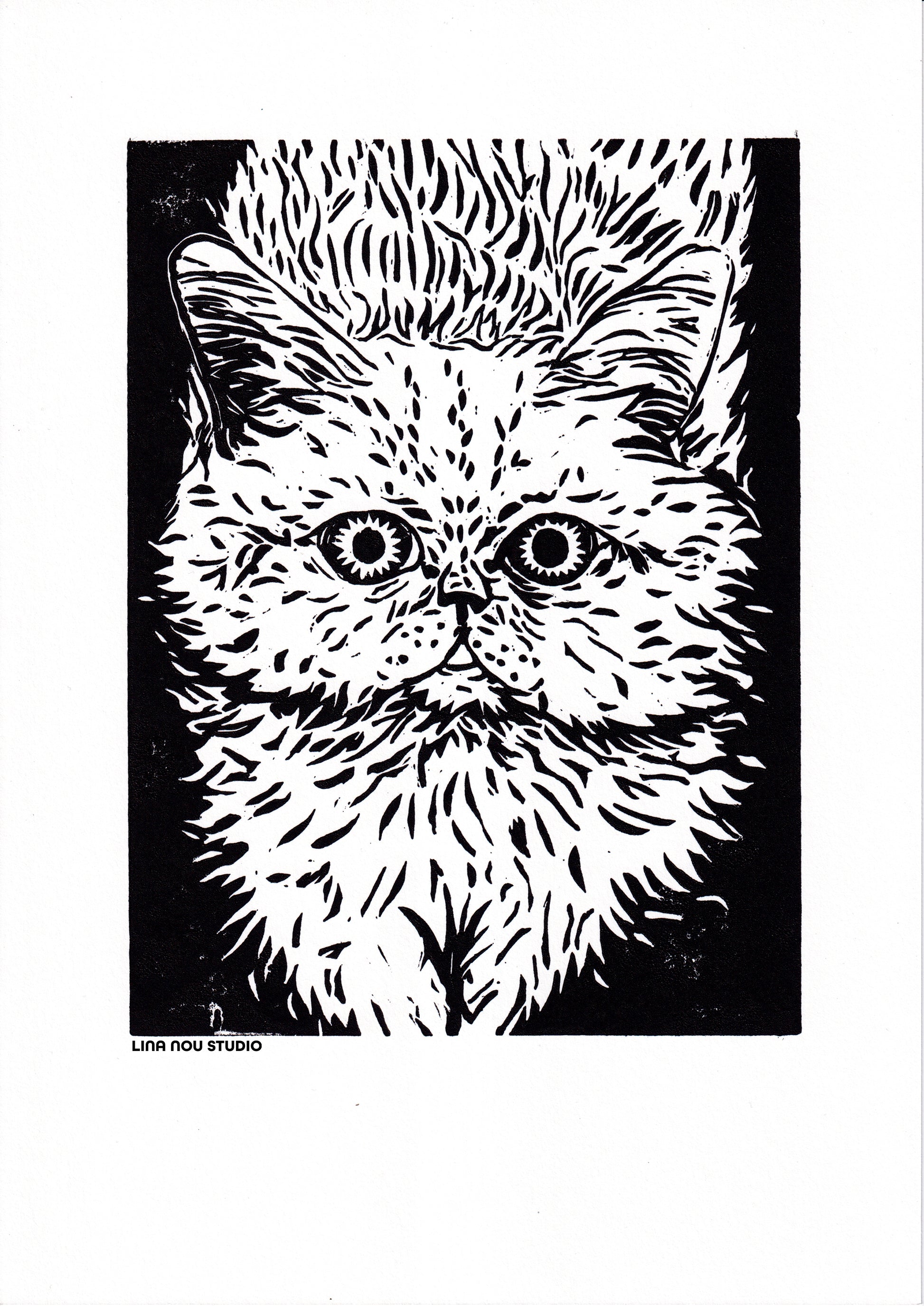 This print was a commission from a cousin of mine, depicting her lovely and wide-eyed cat Joy, who is fluffy and intense in her stare. 'Joy the Cat' - Ink on paper, 2024
