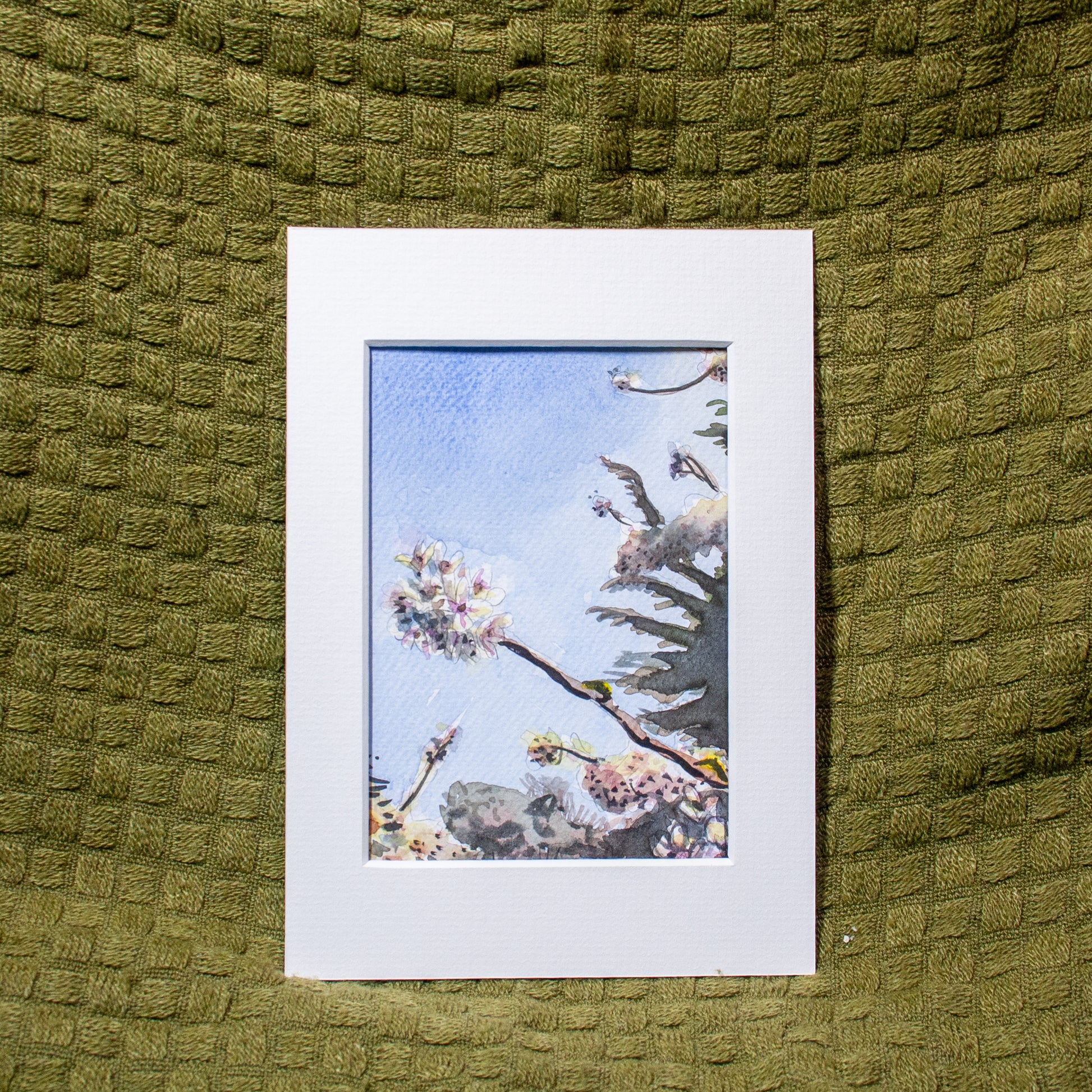This original mounted watercolour painting was a quick and loose exploration into capturing the delicate cherry blossom flowers of Kew Gardens after visiting for the first time. The blue of the sky and the grey shadows of the shrubbery in the background are ways that the scene feels light like the petals in the subject matter.