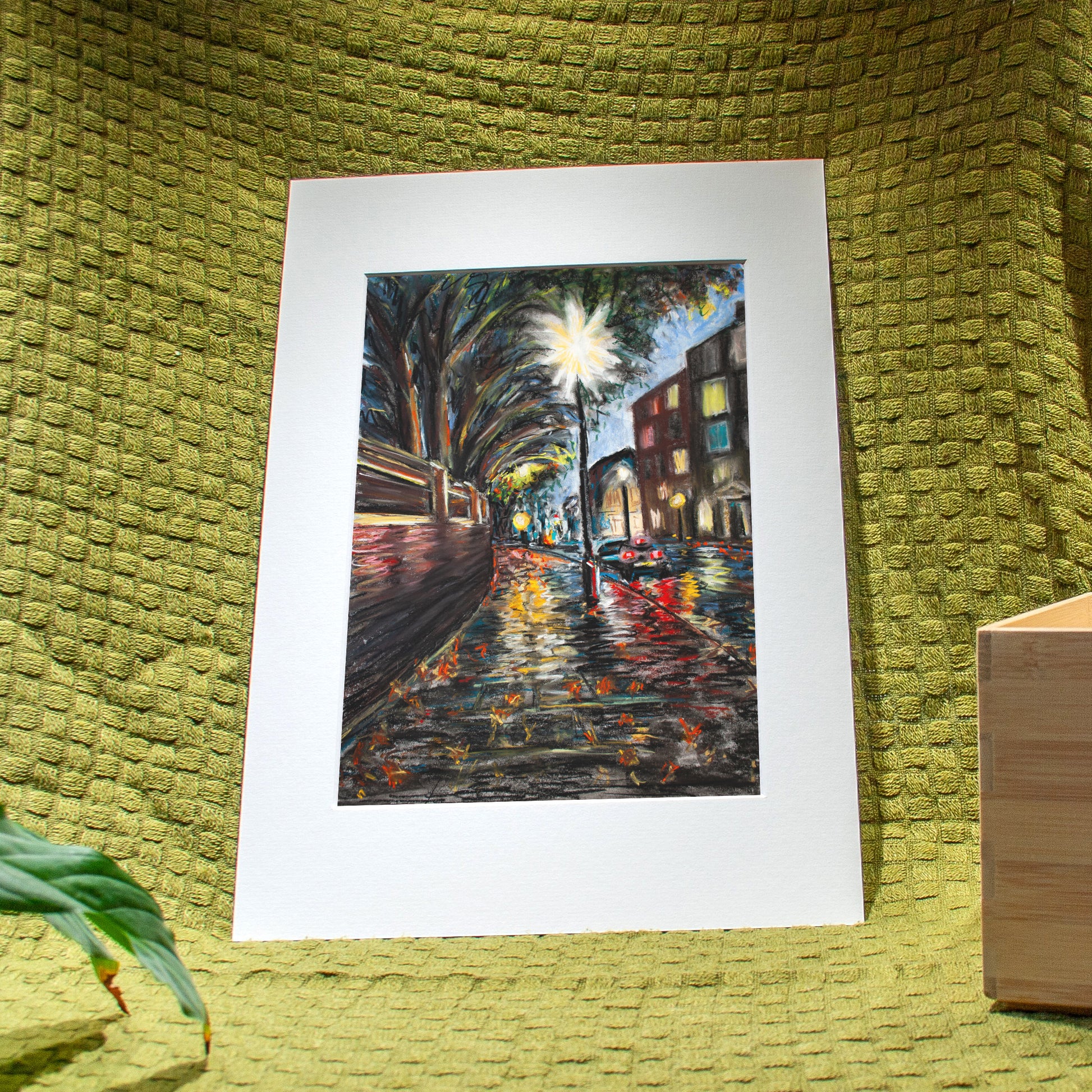This print is of a soft pastel drawing depicting a rainy night streetscape in London. The use of the medium of soft pastels is used to its advantage, bleded together to emphasise the wet ground and bleeding reflections merging with one another against an otherwise dark scene. This scene was one of the first of 2025 to explore the use of soft pastel and how its properties can create affects that paintings otherwise couldn't. ‘Shiny Streets’ - Soft pastel on paper, 2025