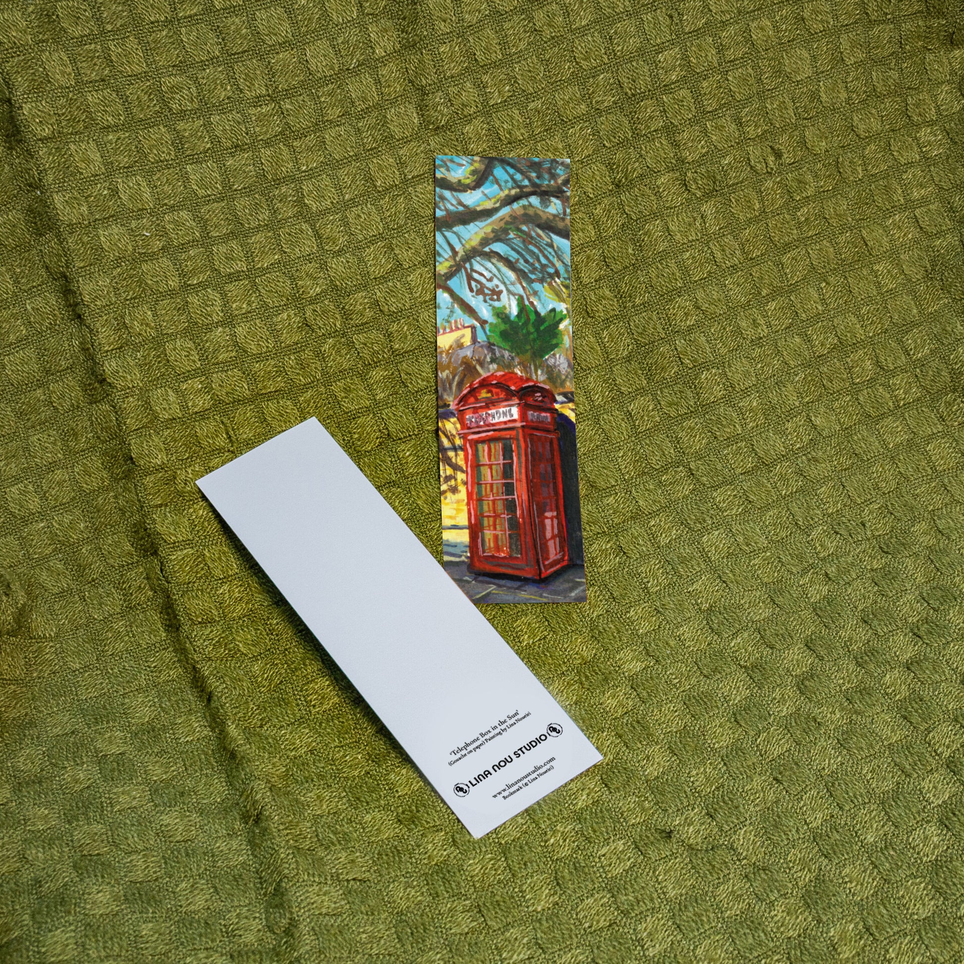 This bookmark is of painted street scene on a residential street in London, where a red telephone box typical to the city basks in the sunshine, as a tree tickles it with shade. ‘Telephone Box in the Sun’ - Gouache on paper, 2024