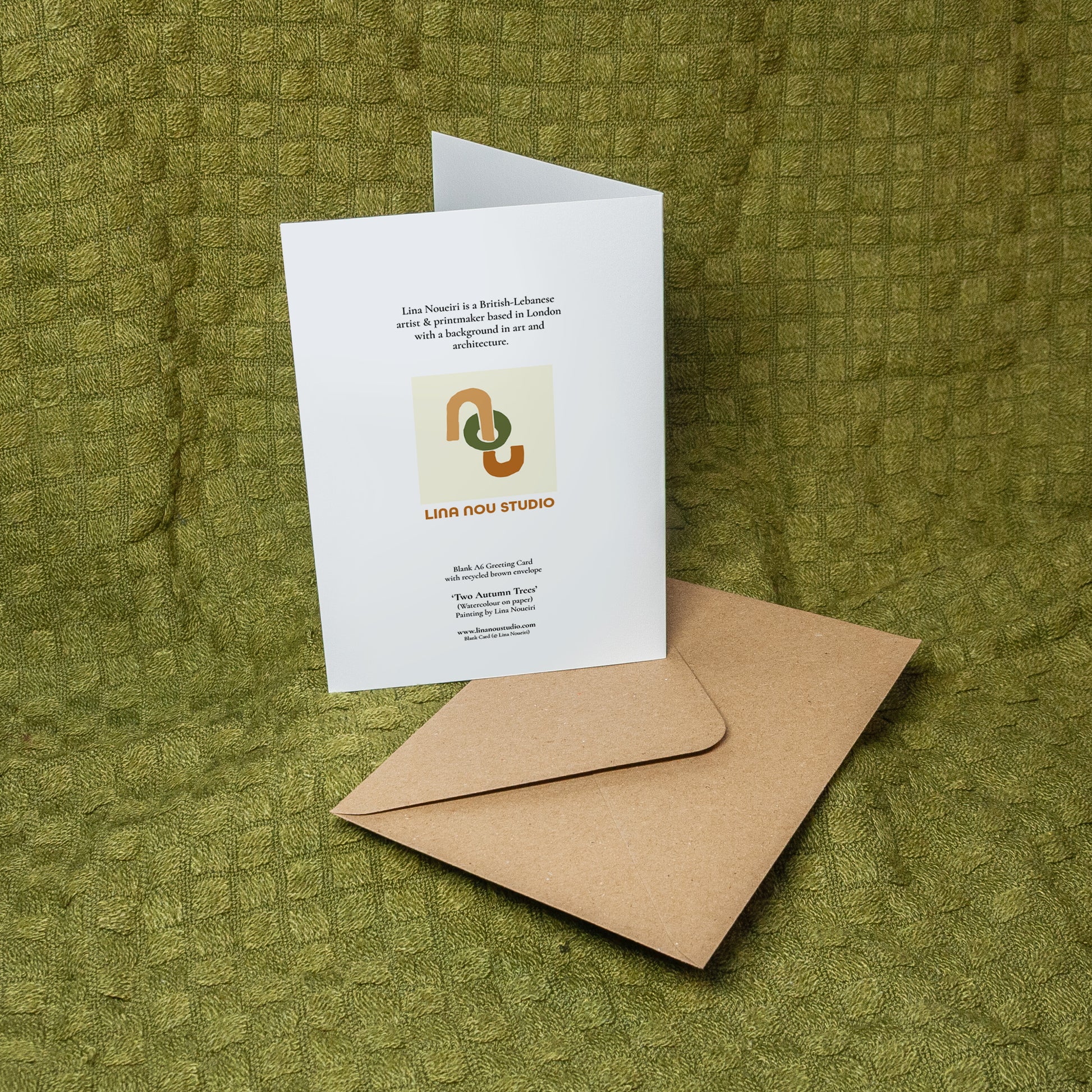 This card is of loose painting of bright red and yellow leaves on two autumn trees in the park. The grass behind is still green to show the changing seasons. 'Two Autumn Trees' - Watercolour on paper, 2025